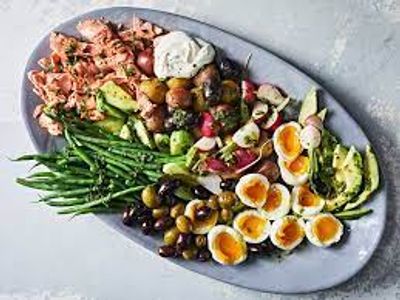 In large sauce pan, bring to 2-inches of water to boil over high heat. Reduce heat to medium. Place potatoes in steamer over water, cover and steam 10 minutes. Add carrots and beans to potatoes in steamer; cover and steam 8-10 minutes or until vegetables are crisp and tender. Rinse vegetables with cold water to cool; drain. In a large bowl place vegetables and 1⁄2 c of French dressing. Then add all other ingredients, except mixed salad greens, eggs, olives and tuna. Toss with another 1⁄2 c of dressing. Refrigerate 1 hour to marinate.