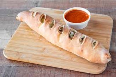 Preheat oven to 375°. Place bread dough on a lightly greased baking sheet. Pat to a 15"x10" rectangle. Arrange mozzarella cheese lengthwise down center; layer with pepperoni, then provolone, and ham last. Moisten edges of dough with water. Bring each long edge of dough to center; press with melted butter; and bake for 20 minutes or until lightly browned. Cool on wire rack. Gently coat with melted butter brushed on top and sprinkled with garlic salt. Offer pizza sauce alongside for dipping. An Electric knife works best for slicing.